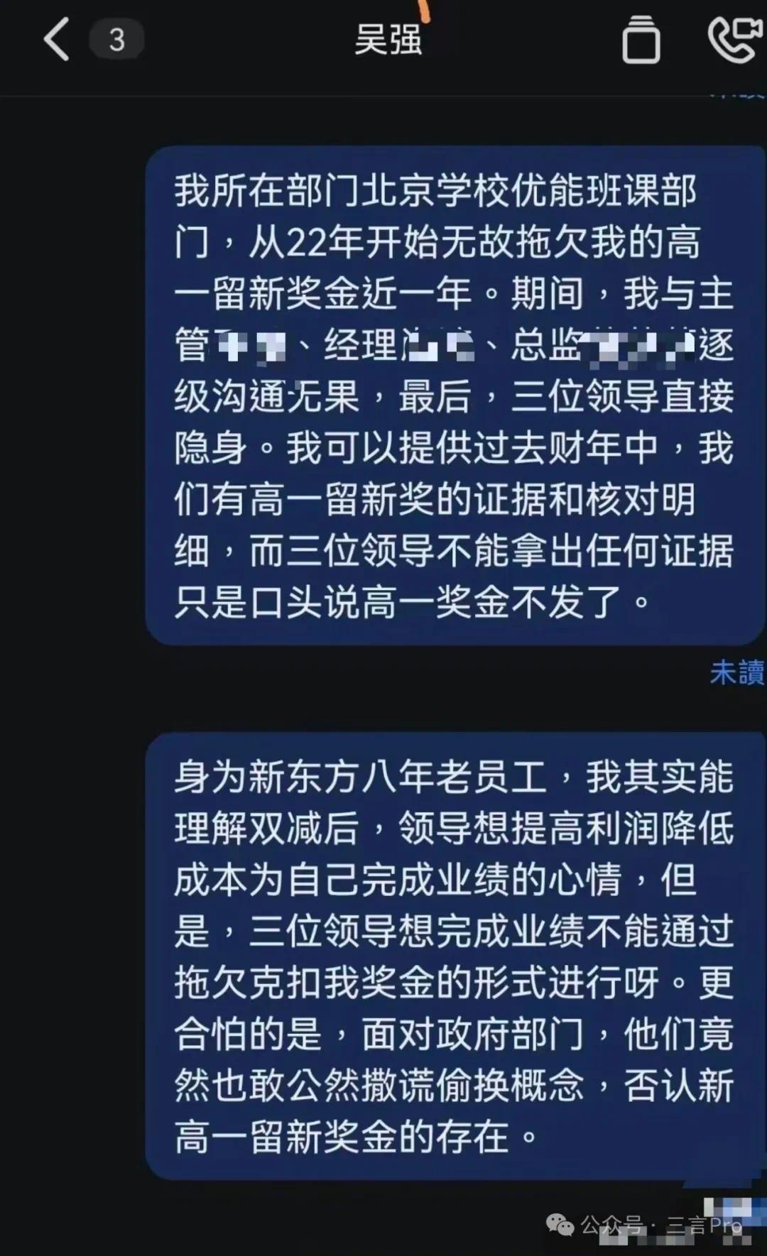 爆料人還展示了2023年5月17日與俞敏洪及疑似新東方高級(jí)副總裁吳強(qiáng)的釘釘聊天記錄,內(nèi)容是反饋部門高一年級(jí)薪酬被拖欠近一年,且已向主管、經(jīng)理、總監(jiān)逐級(jí)反映但均無回應(yīng),截圖顯示俞敏洪和吳強(qiáng)的聊天狀態(tài)為未讀。