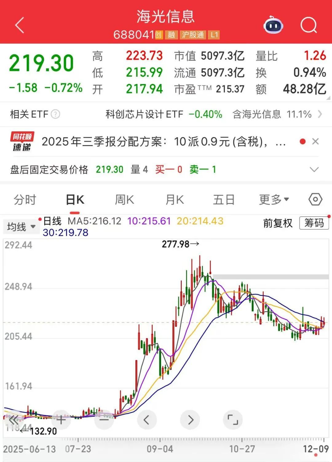 根據(jù)同花順數(shù)據(jù),12月9日收盤(pán)時(shí),中科曙光股價(jià)為100.13元/股,總市值1465億元;海光信息股價(jià)報(bào)219.3元/股,總市值達(dá)5097億元。
