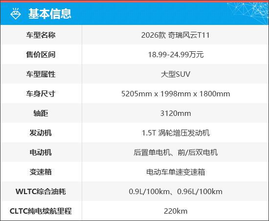 2026款奇瑞風(fēng)云T11推出4款配置,售價(jià)18.99-24.99萬元,限時(shí)搶鮮價(jià)17.99-23.99萬元。全系搭載增程式動(dòng)力,配備獵鷹500/700輔助駕駛系統(tǒng),覆蓋高速、城市及泊車場(chǎng)景,高速NOA支持匝道通行與超車變道。