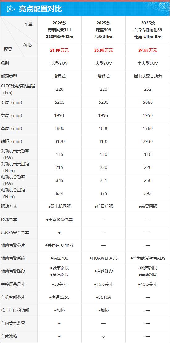同價(jià)位競(jìng)品稀缺,主要對(duì)比深藍(lán)S09(大型SUV)與傳祺向往S9(中大型SUV)。風(fēng)云T11入門價(jià)最低,配置更優(yōu),尤其安全氣囊與獵鷹700輔助駕駛系統(tǒng)是核心優(yōu)勢(shì)。