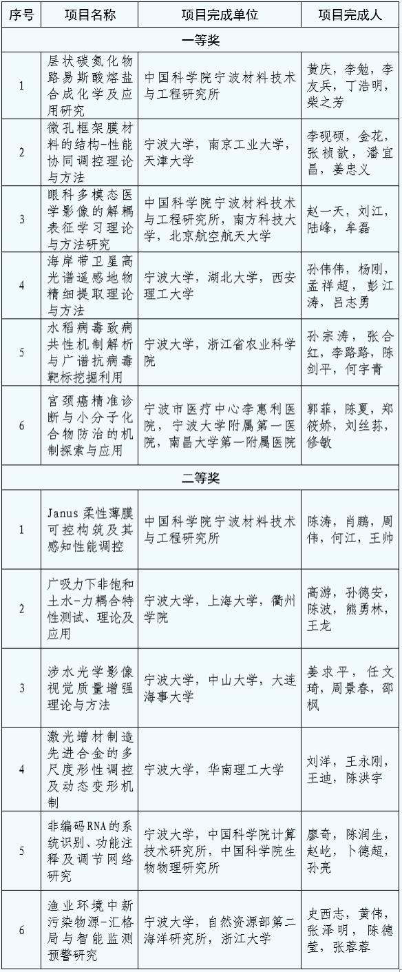 寧波市自然科學(xué)獎獲獎項目名單(排序不分先后)
