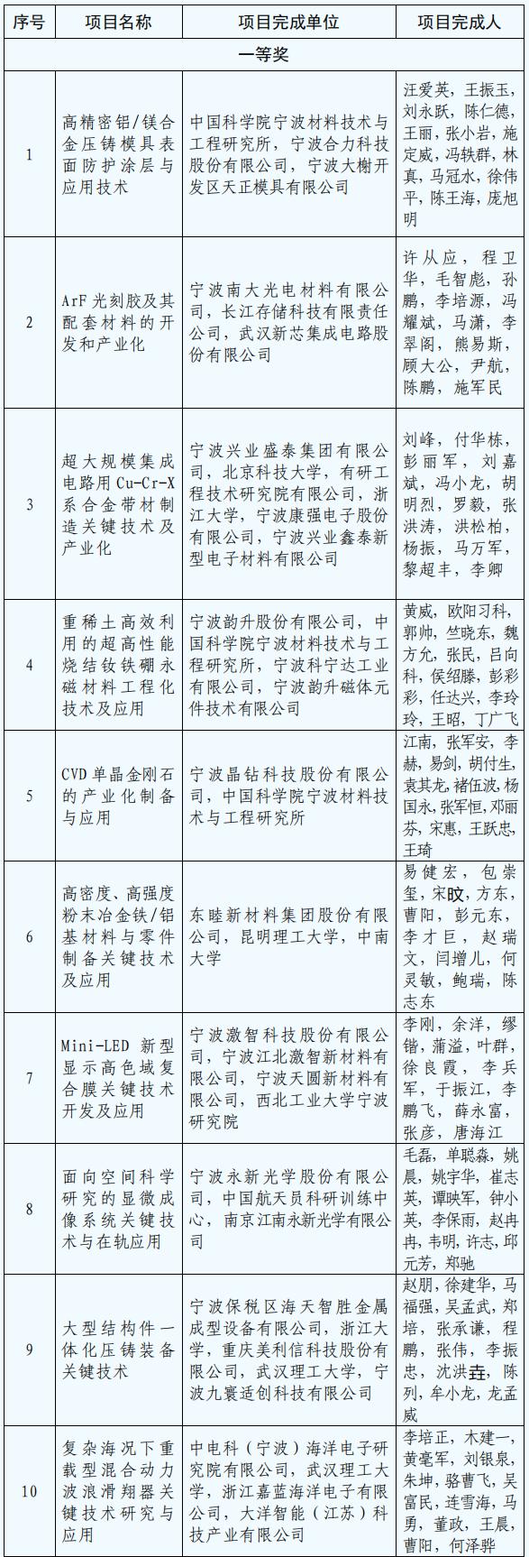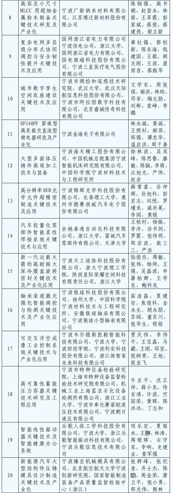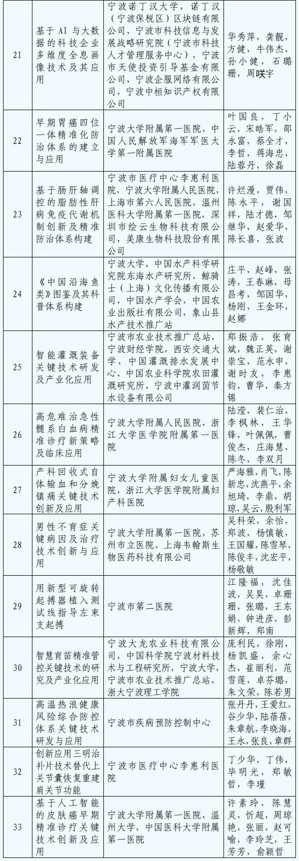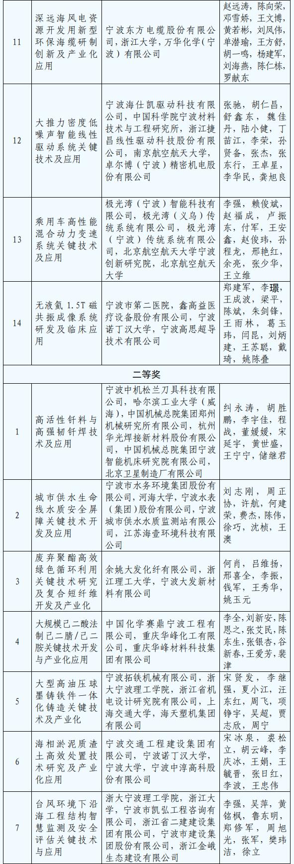 寧波市科學(xué)技術(shù)進(jìn)步獎(排序不分先后)