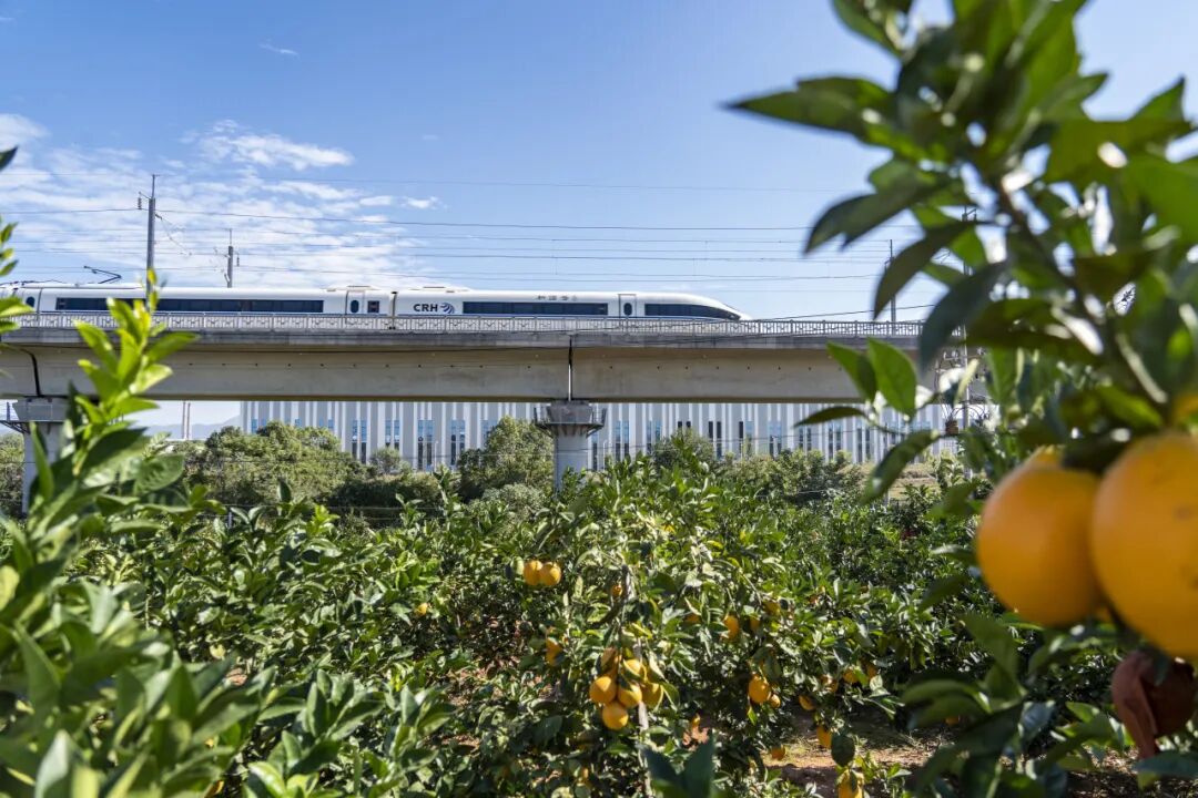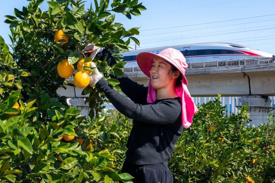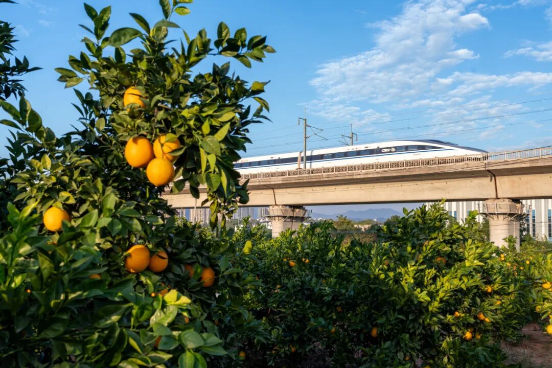 冬日的贛南大地,臍橙園里一片金黃,處處都透著豐收的喜悅。果園旁,一列列高鐵如同長龍般疾馳而過,與金黃的臍橙構(gòu)成了一幅美麗的畫卷。