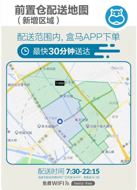 目前在盒馬App中,已能看到新增的旺莊前置倉配送范圍地圖,周邊居民可提前體驗(yàn)線上購物服務(wù)。