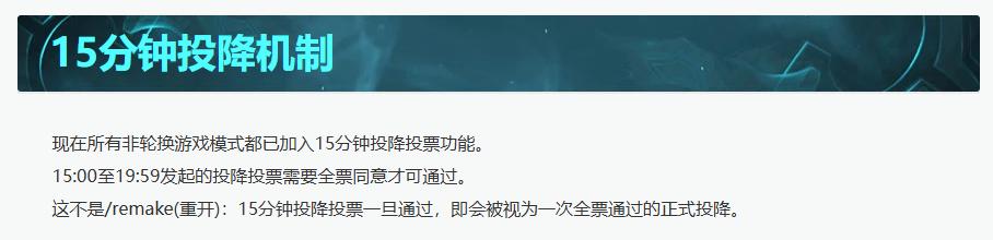 為順應趨勢,《英雄聯(lián)盟》不僅把投降投票啟動時間從20分鐘改成15分鐘,今年還取消了提前投降需全員同意的規(guī)則,改為多數(shù)決。后續(xù)推出的新玩法,也盡量將對局時長控制在20分鐘甚至15分鐘內。