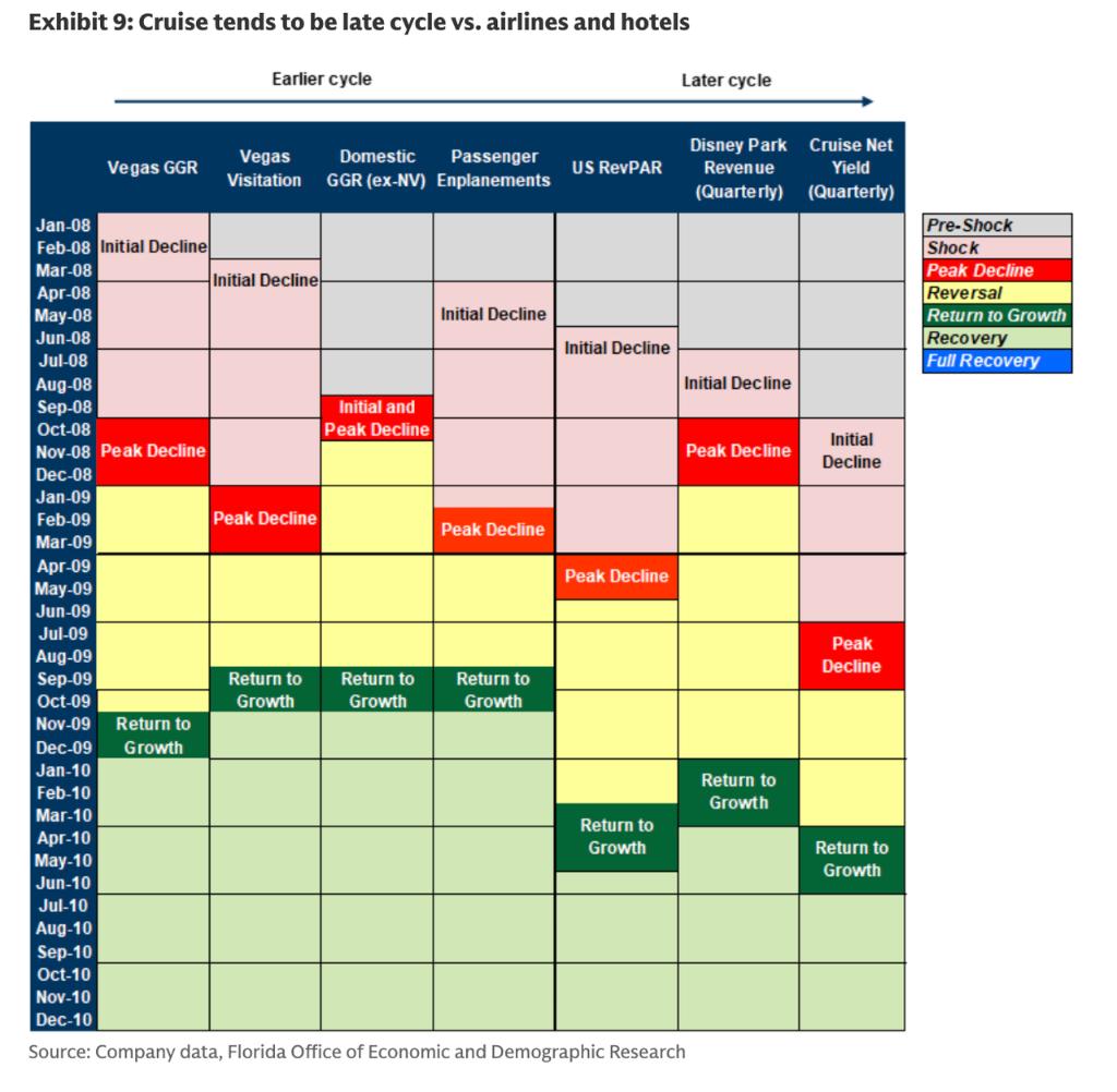 這意味著,郵輪行業(yè)的晚周期低迷與拉斯維加斯、航空業(yè)的早周期回撤之間,存在18至24個月的時間差。