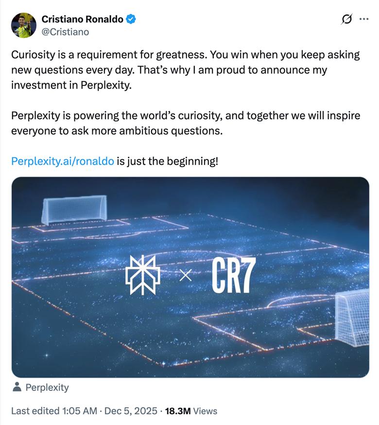 在最近的2025年12月5日,C羅正式購入美國生成式搜索獨(dú)角獸Perplexity AI的股份,成為戰(zhàn)略股東。