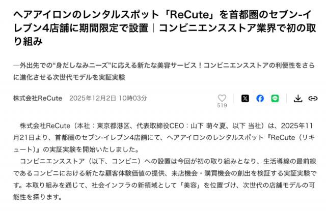 以11月21日起日本7-ELEVEn與ReCute合作推出的“美發(fā)器租賃服務(wù)”為例,該項服務(wù)看似只是多了一臺設(shè)備,本質(zhì)上卻是對便利店角色的重新定義。