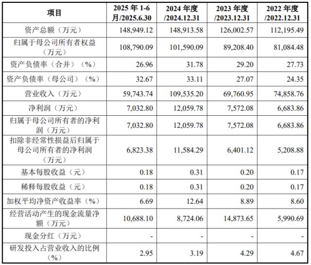 2022年至2024年及2025年上半年(報告期),宇隆科技營業(yè)收入依次為7.49億元、6.98億元、10.95億元和5.97億元;歸屬于母公司所有者的凈利潤分別為6683.86萬元、7572.08萬元、1.21億元和7032.80萬元。