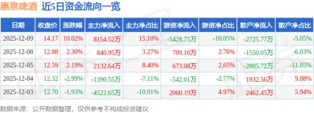 盤中異動:惠泉啤酒(600573)12月10日早盤9點30分漲停