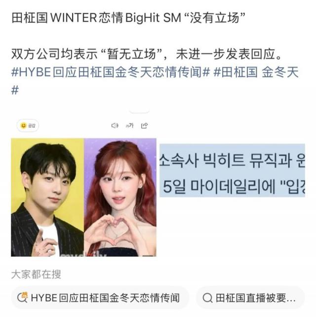 然而,經(jīng)紀(jì)公司的回應(yīng)卻讓事件更顯撲朔迷離。HYBE表示“正在核實(shí)”,SM則稱“沒(méi)有立場(chǎng)”,這種模糊的態(tài)度引發(fā)網(wǎng)友質(zhì)疑:“單身很難說(shuō)出口嗎?不正面回應(yīng)難免讓人當(dāng)真?!?/p>