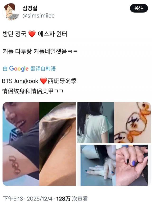 事件的導(dǎo)火索是網(wǎng)友發(fā)現(xiàn)兩人手臂上都有“三只小狗”紋身,隨后又扒出拖鞋、短褲、美甲等多款“同款”物品,甚至有網(wǎng)友稱曾偶遇他們一同看演唱會(huì),田柾國(guó)也被指現(xiàn)身aespa演唱會(huì)現(xiàn)場(chǎng),戀愛(ài)猜測(cè)由此傳開(kāi)。