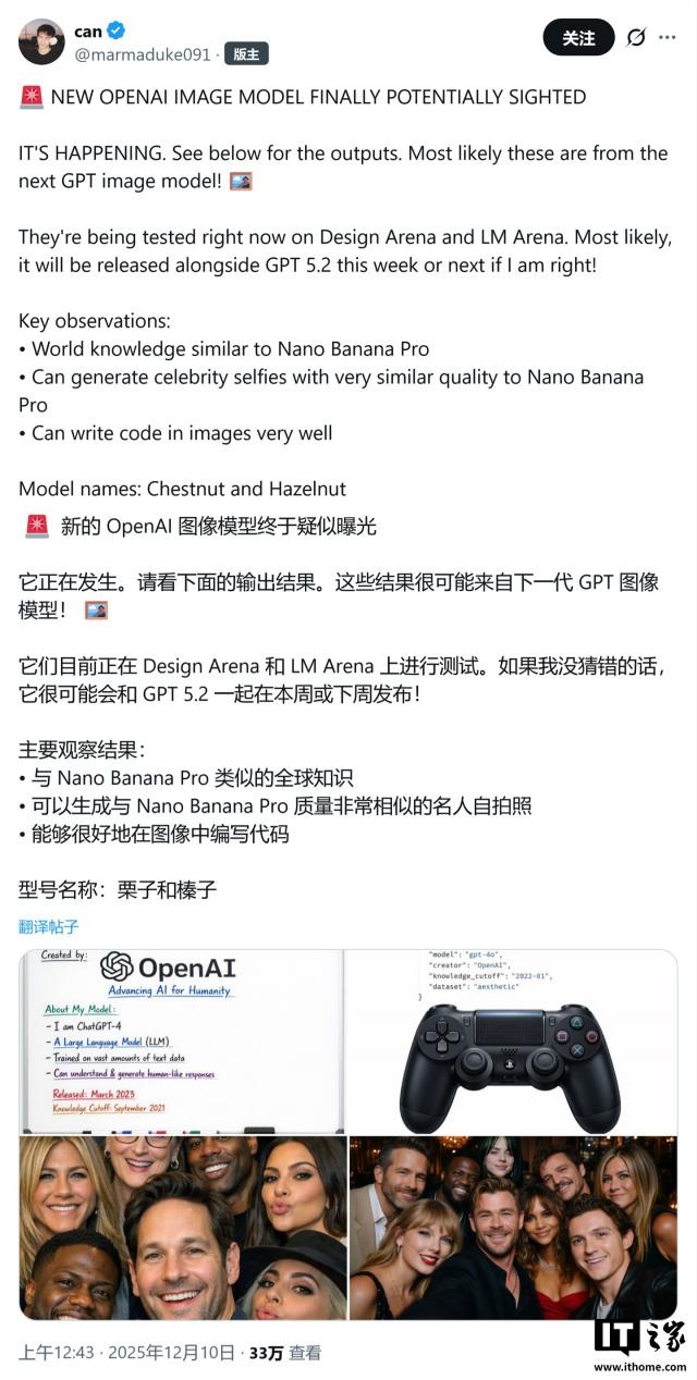 IT之家12月10日消息,X平臺用戶@marmaduke091今日發(fā)布推文稱,在gpt-image-1模型發(fā)布七個月后,OpenAI正在測試代號為“Hazelnut(榛子)”和“Chestnut(栗子)”的兩款全新AI圖像生成模型。
