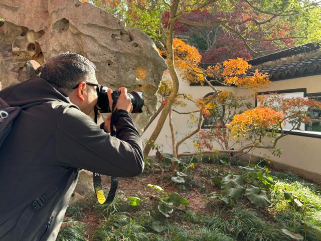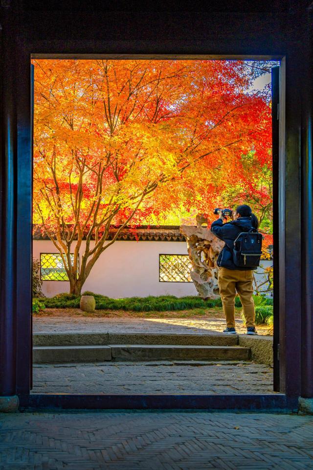 醉白池的楓葉,將園林的各個(gè)角落都染上了濃郁的色彩。游客在主干道橋堍、雪海堂庭院、盆景園等區(qū)域,都能邂逅這般色彩飽滿的景致。“楓樹與古典園林的氛圍完美融合,楓葉造型也十分別致。我今天特意從浦東趕來,就是為了定格醉白池這動(dòng)人的‘楓’景?!庇慰屠钕壬吪恼者呎f道。