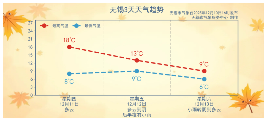 今日天氣晴轉(zhuǎn)多云,最高氣溫約18℃。12日起,受強(qiáng)冷空氣影響,氣溫將顯著下降,15日早晨最低溫或降至-3℃左右。降水方面,12日后半夜到13日上午有短暫降雨,14日后以云系變化為主。
