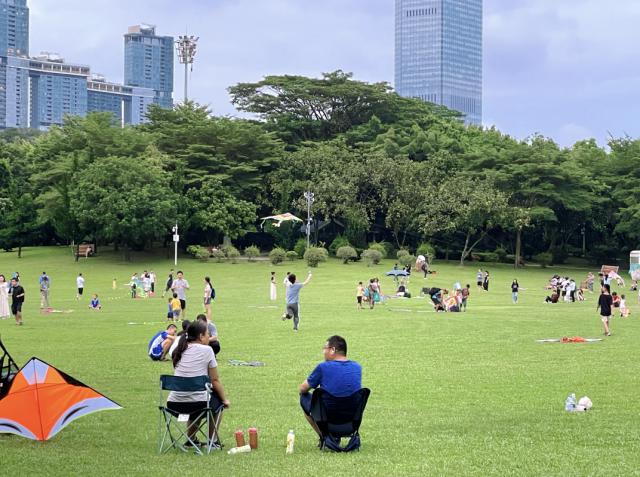 從蓮花山公園南門進入,首先映入眼簾的就是8萬平方米的巨型草坪,這里場地開闊、微風拂面,是市民放風箏的首選之地。公園里有花有草、有山有湖,累了就能坐在樹蔭下歇腳,讓忙碌帶來的疲憊感在這里慢慢消散。