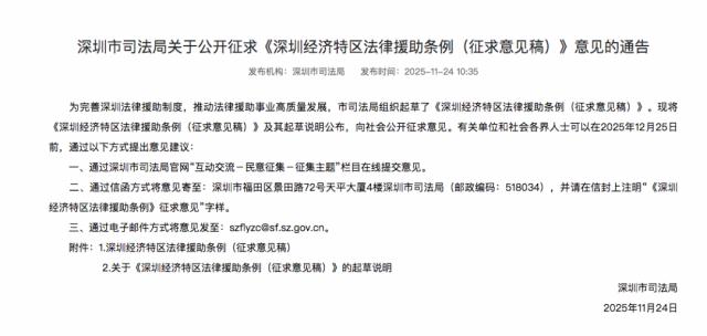 《深圳經(jīng)濟特區(qū)法律援助條例(征求意見稿)》已公開向社會征求意見,擬擴大法律援助覆蓋范圍,明確討薪工傷、見義勇為等情形可免經(jīng)濟困難核查。