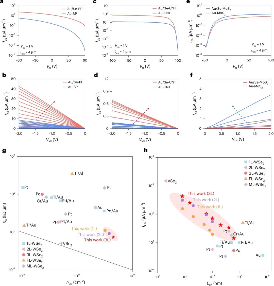 這項工作的意義不僅在于實現(xiàn)個別器件性能的突破,更在于其展現(xiàn)出的普適性與工藝兼容性。該策略成功拓展至黑磷、碳納米管等多種p型半導(dǎo)體材料,均帶來顯著性能提升,證明其廣泛適用性。理論計算與實驗表征相結(jié)合,從原子結(jié)構(gòu)、電子態(tài)到宏觀電學(xué)性能,完整闡釋了能帶雜化硒接觸的工作機(jī)制,特別是計算得出的低隧穿電阻率與實驗結(jié)果相互印證,奠定了堅實物理基礎(chǔ)。與現(xiàn)有技術(shù)的基準(zhǔn)對比表明,該接觸方案在接觸電阻和驅(qū)動電流方面均達(dá)到領(lǐng)先水平,為未來高性能、低功耗的p型納米電子電路鋪平了道路。