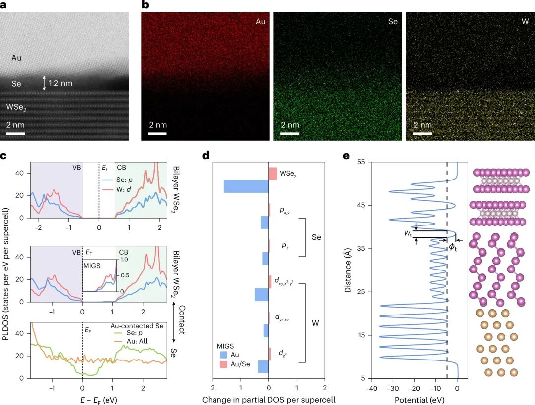 圖4從微觀結(jié)構(gòu)與理論計算層面,深入揭示能帶雜化硒接觸實現(xiàn)低電阻的物理機(jī)制。橫截面像差校正掃描透射電子顯微鏡圖像直觀展示了金/硒/WSe?界面的原子級結(jié)構(gòu):一層連續(xù)、均勻的超薄硒層夾在金電極與WSe?半導(dǎo)體之間,且WSe?晶格結(jié)構(gòu)保持完整,證實溫和沉積工藝能形成清晰、無損的異質(zhì)結(jié)界面,為高效電荷傳輸提供理想通道。對應(yīng)的能量色散X射線光譜元素分布圖清晰顯示硒元素在金與鎢之間的連續(xù)均勻分布,這種連續(xù)性對確保整個接觸界面電學(xué)性質(zhì)均勻一致至關(guān)重要,避免因界面不均導(dǎo)致局部高電阻或電流擁擠問題。