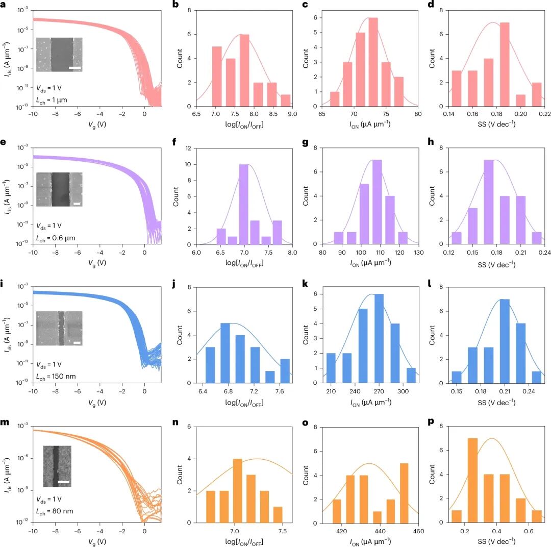 圖3通過詳盡統(tǒng)計學(xué)分析,評估能帶雜化硒接觸策略在不同溝道長度器件中的性能一致性與可擴(kuò)展性。研究系統(tǒng)性制備并測量了溝道長度為1微米、0.6微米、150納米、80納米的WSe?晶體管陣列,每個尺寸對應(yīng)的轉(zhuǎn)移特性曲線簇顯示出極小的器件間差異與可忽略的滯回,表明基于硒接觸的制備工藝具有高度可控性與可重復(fù)性,是邁向大規(guī)模集成的先決條件。對開關(guān)比、開態(tài)電流、亞閾值擺動等關(guān)鍵性能參數(shù)的統(tǒng)計分析以直方圖形式呈現(xiàn):數(shù)據(jù)顯示,當(dāng)溝道長度從1微米縮減至150納米時,開態(tài)電流顯著增加,而開關(guān)比和亞閾值擺動基本保持穩(wěn)定,體現(xiàn)接觸電阻降低與溝道縮放對驅(qū)動電流的正向貢獻(xiàn),同時器件開關(guān)特性未受損害。但溝道長度進(jìn)一步縮小到80納米時,開關(guān)比和亞閾值擺動出現(xiàn)輕微退化,這可能是短溝道效應(yīng)開始顯現(xiàn),但開態(tài)電流仍達(dá)峰值——這種權(quán)衡關(guān)系是納米尺度器件的普遍特性,并不影響硒接觸本身的高效性。累積分布函數(shù)圖進(jìn)一步量化了這些參數(shù)的分布集中度。所有結(jié)果共同表明,能帶雜化硒接觸策略在不同尺寸器件上均能提供一致且優(yōu)異的性能,其器件間低變異性凸顯該技術(shù)對于未來大規(guī)模、高密度集成電路制造的適用性與可靠性。
