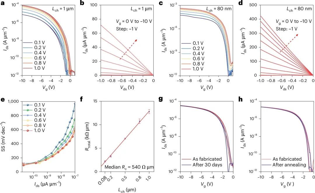 圖2全面展示了采用能帶雜化硒接觸的p型WSe?場效應(yīng)晶體管的卓越電學(xué)性能。圖中首先呈現(xiàn)溝道長度1微米器件的轉(zhuǎn)移特性與輸出特性曲線:轉(zhuǎn)移曲線顯示高達(dá)10^8的開關(guān)比及可忽略的滯回,表明器件柵控能力優(yōu)異、界面質(zhì)量良好;輸出曲線在低偏壓下的線性特征,直接證實高質(zhì)量歐姆接觸成功形成,空穴注入效率極高。隨著溝道長度按比例縮小至80納米,器件性能優(yōu)勢更凸顯——在1 V漏源電壓下實現(xiàn)430 μA/μm的飽和開態(tài)電流密度,這一高電流密度在短溝道器件中的保持,對現(xiàn)代電子學(xué)小型化與高性能化至關(guān)重要,證明該接觸策略在器件微縮過程中的魯棒性。通過轉(zhuǎn)移長度法提取的接觸電阻低至540 Ω·μm,這是本工作核心性能指標(biāo)之一,遠(yuǎn)低于此前采用鉑或鈀接觸的器件,標(biāo)志p型半導(dǎo)體接觸技術(shù)的重大突破,極低接觸電阻確保驅(qū)動電流不會在電極界面處嚴(yán)重?fù)p耗。器件長期穩(wěn)定性與熱穩(wěn)定性測試結(jié)果進(jìn)一步支撐其應(yīng)用潛力:在空氣中儲存一個月或200攝氏度惰性氣體中退火后,器件轉(zhuǎn)移特性幾乎無退化;同時X射線光電子能譜確認(rèn)退火后硒信號仍清晰存在,表明硒/金接觸結(jié)構(gòu)具有出色化學(xué)與環(huán)境穩(wěn)定性,能滿足后端工藝與實際應(yīng)用對可靠性的嚴(yán)苛要求。