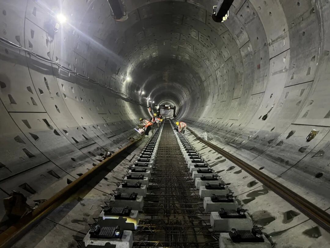 針對(duì)這一情況,項(xiàng)目團(tuán)隊(duì)創(chuàng)新采用高度協(xié)同的“流水線”施工模式,將施工作業(yè)面科學(xué)劃分為10個(gè)作業(yè)區(qū)段,使軌排搭設(shè)、鋼筋綁扎、軌道精調(diào)、混凝土澆筑等工序交叉推進(jìn)、無縫銜接,最終實(shí)現(xiàn)了日均鋪軌120米的高效施工進(jìn)度。
