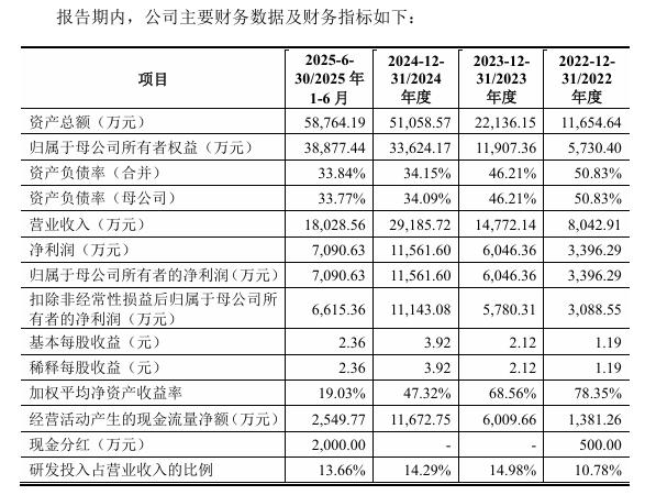 財(cái)務(wù)數(shù)據(jù)顯示,2022年至2024年,公司分別實(shí)現(xiàn)營業(yè)收入0.80億元、1.48億元和2.92億元,同期歸母凈利潤(rùn)為3396.29萬元、6046.36萬元和1.16億元。2025年上半年,公司營業(yè)收入達(dá)1.8億元,歸母凈利潤(rùn)7091萬元。