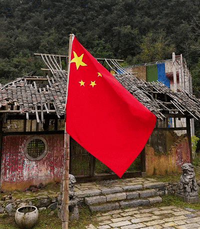 鮮艷的五星紅旗在老屋前飄揚