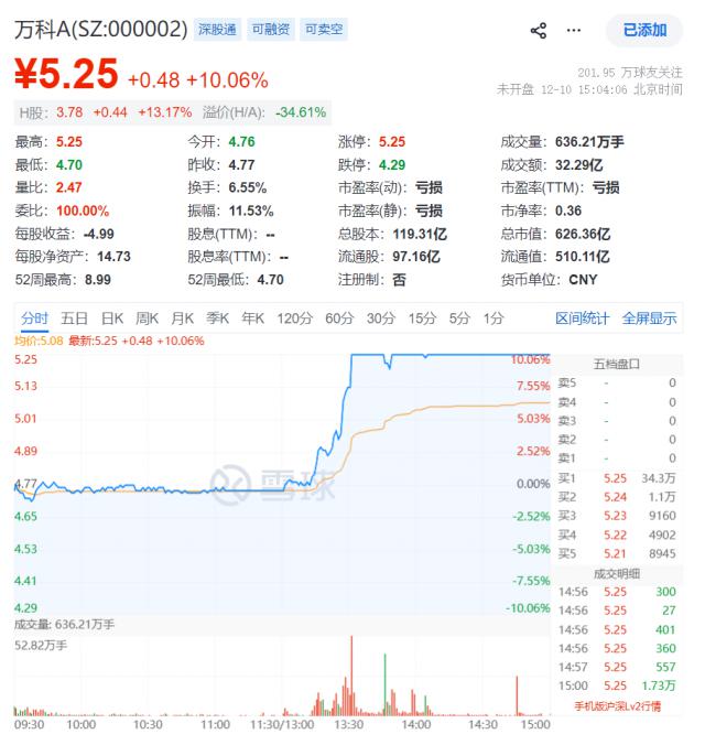 樂(lè)居財(cái)經(jīng) 趙盼盼 12月10日,萬(wàn)科A(股票代碼:SZ:000002)在盤中出現(xiàn)直線拉升并封死漲停板。截至當(dāng)日收盤,其股價(jià)上漲10.06%,報(bào)收5.25元/股,對(duì)應(yīng)總市值約為626.36億元。與此同時(shí),港股上市的萬(wàn)科企業(yè)(股票代碼:HK:02202)盤中漲幅一度突破16%,最終收盤時(shí)漲幅回落至13.17%,股價(jià)定格在3.78港元。