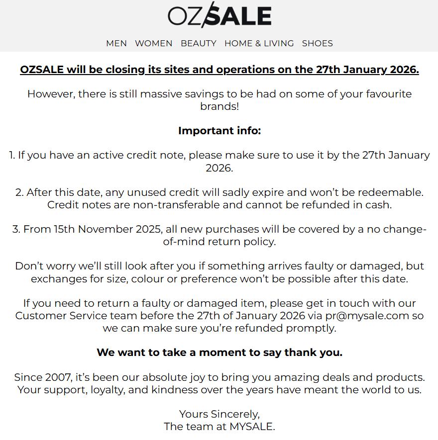 聚美麗了解到,有“海外版唯品會”之稱的澳大利亞知名電商平臺Ozsale近日確認,將于2026年1月27日關閉網站并停止運營,屆時未使用的積分將失效,且從2025年11月15日起不再接受無理由退換貨。