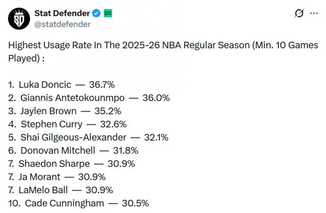 另外,美媒Stat Defender統(tǒng)計(jì)了本賽季至今聯(lián)盟球權(quán)使用率最高的球員排名(需至少出戰(zhàn)10場):