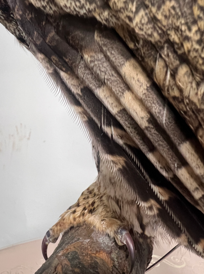 如今,這只灰林鸮以標(biāo)本形式“重生”:雙目圓睜,立于樹樁之上,羽毛光亮柔軟,姿態(tài)栩栩如生。