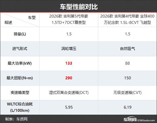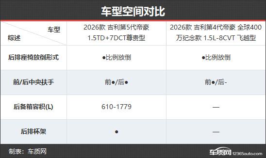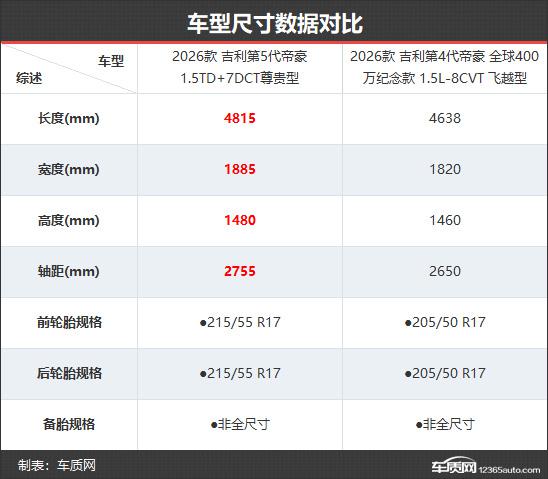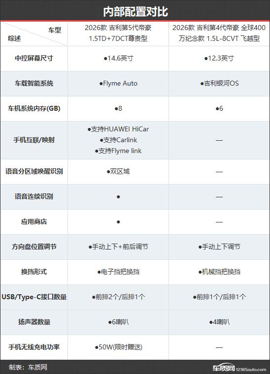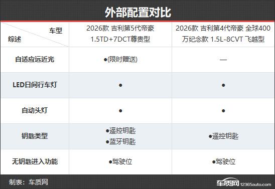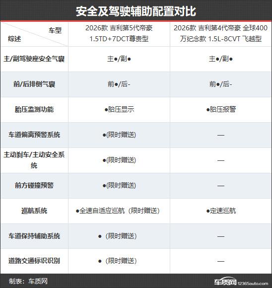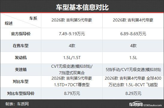 2026款吉利第5代帝豪共推出4款車型,在售車型數(shù)量與2026款第4代帝豪相同。新款的官方起售價和頂配價雖比老款略有上調,但在限時感恩價優(yōu)惠下,全系價格下降9000元,實際更實惠。本次對比選取次頂配版本,以便更直觀地展現(xiàn)配置差異。