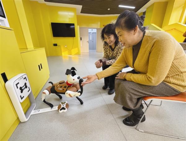 廣開街綜合養(yǎng)老服務(wù)中心7月啟用,記者刷卡乘電梯至三樓“認(rèn)知友好小屋”,見到最受歡迎的智能機(jī)械狗“小白”。中心主任關(guān)莉介紹,中心有17張床位,入住7位老人,“認(rèn)知友好小屋”采用標(biāo)準(zhǔn)化智能配置,小白是“明星”。小白黃白相間,憨態(tài)可掬,趴在專用充電墊上。
