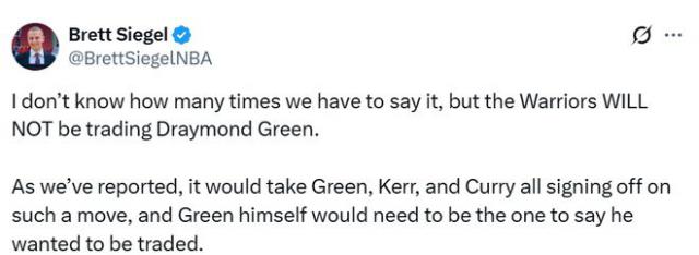 Siegel轉(zhuǎn)發(fā)報(bào)道并強(qiáng)調(diào):"勇士絕不會(huì)交易格林,交易需格林、科爾和庫(kù)里一致同意,且格林主動(dòng)提出離隊(duì)才行。"