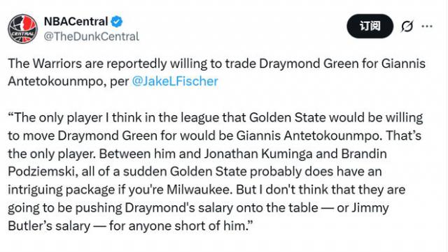 Fischer表示:"在我看來(lái),全聯(lián)盟只有字母哥能讓勇士送走格林。若將格林、庫(kù)明加和波杰姆斯基打包,雄鹿或許會(huì)感興趣,但除非是為了字母哥,否則勇士不會(huì)輕易交易格林,巴特勒的情況也類(lèi)似。"