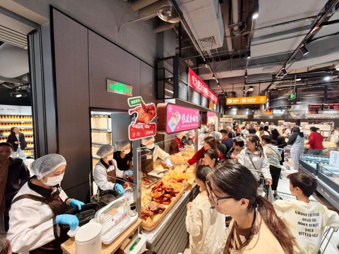 熟食烘焙區(qū)占比大幅提升,是聚攏人氣、提升體驗(yàn)的關(guān)鍵區(qū)域。熟食推出現(xiàn)烤披薩、撈汁小海鮮、椒鹽蹄膀、脆皮香酥鴨,以及福州魚丸、快樂(lè)薯、烤串和地方特色石歧鹵鴿等。