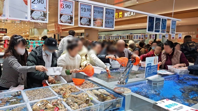 水產(chǎn)區(qū)重點(diǎn)推出帝王蟹、波龍、龍膽石斑魚及藍(lán)鰭金槍魚等全球優(yōu)質(zhì)海產(chǎn)。門店還定期舉辦“金槍魚現(xiàn)場開魚秀”,由專業(yè)師傅現(xiàn)場分割并解說不同部位,讓顧客在選購的同時(shí),感受鮮活和儀式感。