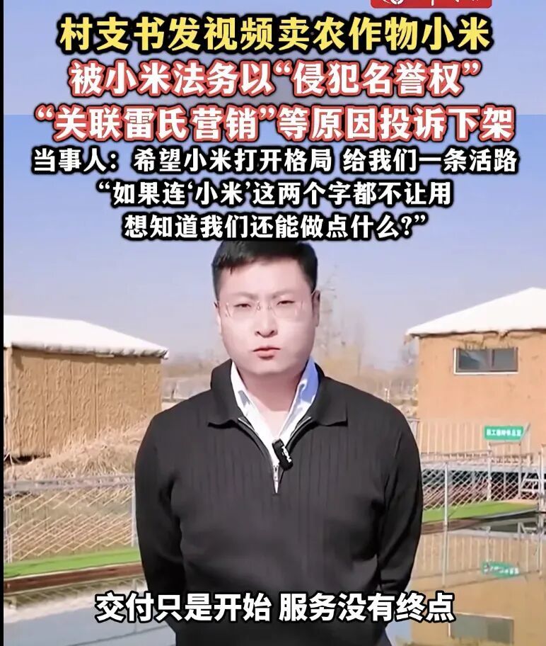 12月10日,山東威海某村支書馮玉寬在電商平臺發(fā)布的谷物小米銷售視頻突然下架。據(jù)馮玉寬透露,視頻因小米公司法務(wù)部門投訴而下架,投訴理由涉及“關(guān)聯(lián)雷氏營銷”與“丑化小米高管形象”。
