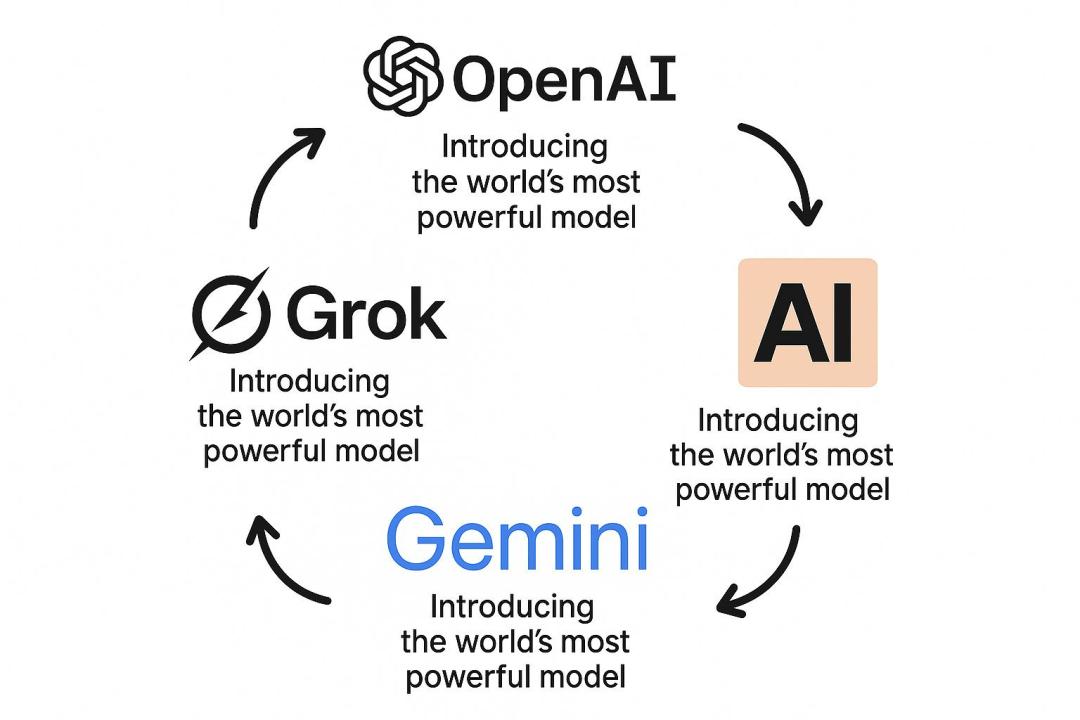 許多讀者看過這張圖,形象展示硅谷閉源模型陷入的「無限戰(zhàn)爭」,四家巨頭輪流宣稱擁有「最強(qiáng)模型」,形成四足鼎立膠著局面。雖只是網(wǎng)友吐槽,也側(cè)面反映目前沒有廠商能建立絕對技術(shù)統(tǒng)治力。