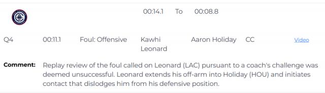 本場(chǎng)比賽關(guān)鍵時(shí)刻的另外兩個(gè)焦點(diǎn)判罰,是小賈巴里?史密斯和萊昂納德先后被吹進(jìn)攻犯規(guī),裁判報(bào)告確認(rèn)這兩次判罰都沒有問題。