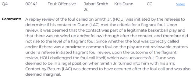 需要說明的是,在裁判主動(dòng)發(fā)起的惡意犯規(guī)復(fù)審過程中,原始犯規(guī)判罰是否準(zhǔn)確以及該回合是否存在類似普通犯規(guī)的情況,都不在可復(fù)審的范圍內(nèi)。因此,在惡意犯規(guī)復(fù)審結(jié)果出來后,火箭隊(duì)隨即對(duì)原始犯規(guī)判罰本身提出挑戰(zhàn),但最終挑戰(zhàn)失敗。裁判認(rèn)定,當(dāng)小史密斯轉(zhuǎn)身持球、手臂架在鄧恩身上時(shí),鄧恩處于合法的防守位置。