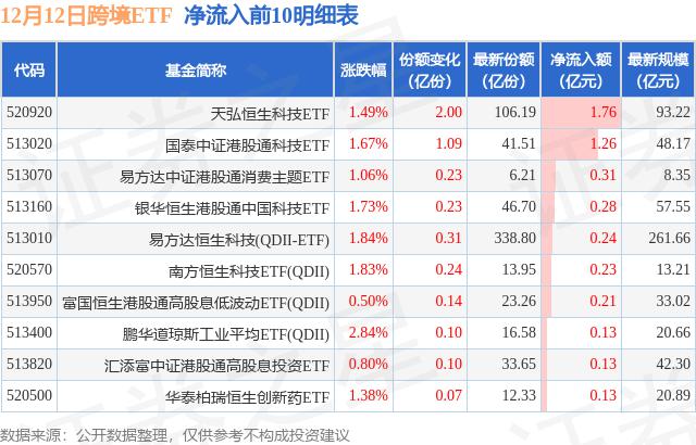 據(jù)證券之星消息,12月12日,跨境ETF基金整體呈現(xiàn)資金流入態(tài)勢(shì),合計(jì)凈流入金額達(dá)4.31億元。從近期表現(xiàn)來看,近5個(gè)交易日該類基金累計(jì)凈流入101.66億元,且這5個(gè)交易日中,每日均實(shí)現(xiàn)資金凈流入(ETF資金流向計(jì)算方式為:(當(dāng)日ETF場(chǎng)內(nèi)流通份額 - 前一交易日ETF場(chǎng)內(nèi)流通份額)× 當(dāng)日ETF均價(jià),此計(jì)算結(jié)果僅供參考)。
