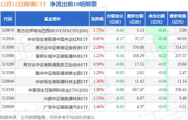 與此同時(shí),當(dāng)日有18只跨境ETF出現(xiàn)資金凈流出。易方達(dá)伊塔烏巴西IBOVESPAETF(QDII)(520870)是凈流出規(guī)模最大的基金,當(dāng)日份額減少4200.0萬份,凈流出額為4140.77萬元。