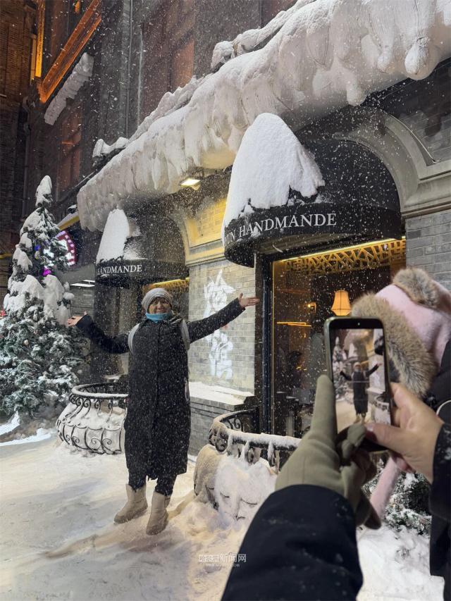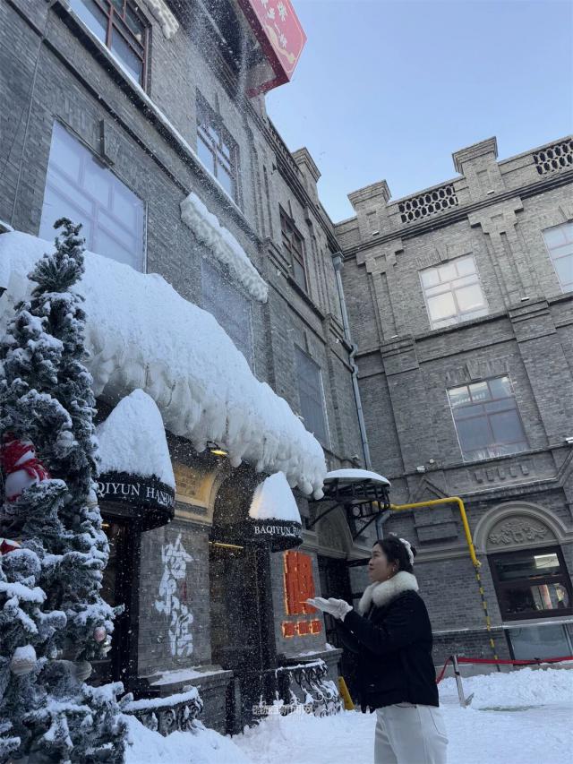 來自廣東的王女士忍不住贊嘆:“真沒想到院子里藏著這么大的驚喜,氛圍特別好?!敝灰娂?xì)密的雪花慢悠悠地飄落,和院落里的建筑、悠揚(yáng)的音樂相互交融,營(yíng)造出一種靈動(dòng)又夢(mèng)幻的美妙意境。