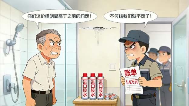 2022年3月,陳老伯家衛(wèi)生間漏水,他上網(wǎng)找了家維修公司。施工前,維修隊說預估要用7到10斤“正規(guī)進口膠水”,每斤198元。陳老伯覺得總價合理就同意了??删S修結束后,領隊軒某卻開出1.4萬元的天價賬單。