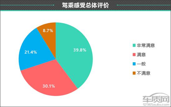 駕乘感受綜合評(píng)價(jià):39.8%非常滿意,30.1%滿意,21.4%一般,8.7%不滿意。