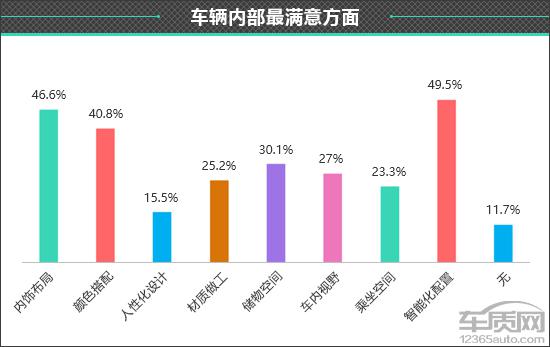 內(nèi)飾方面,49.5%的車(chē)主肯定智能化配置,46.6%認(rèn)可內(nèi)飾布局,40.8%滿意顏色搭配。