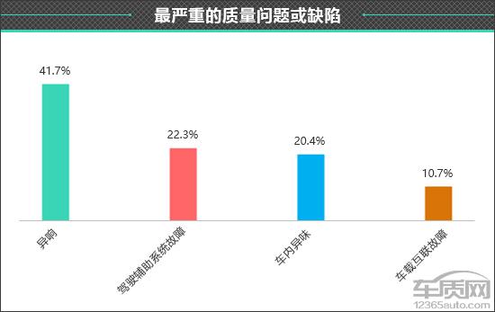 故障類(lèi)型中,車(chē)身附件及電器問(wèn)題占比高,車(chē)主抱怨最多的是異響,占41.7%。