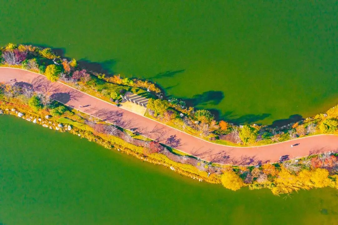 冬日陽光格外柔和,透過疏密枝葉灑下斑駁光影,給環(huán)湖步道添了層夢(mèng)幻濾鏡。沿蜿蜒步道前行,腳下偶爾傳來落葉窸窣輕響,與遠(yuǎn)處湖面粼粼波光交織成韻。微風(fēng)拂過,枝頭彩葉搖曳,姿態(tài)瀟灑,宛如萬千彩蝶起舞,又似層層浪花在公園翻涌,盡顯自然野趣。成片銀杏葉飄落,在步道鋪成柔軟的金色地毯,行人踩上去沙沙作響。這里成了公園熱門打卡點(diǎn),不少市民攜家人、約好友,在此拍照留念,讓歡聲笑語留在冬日晴空下。